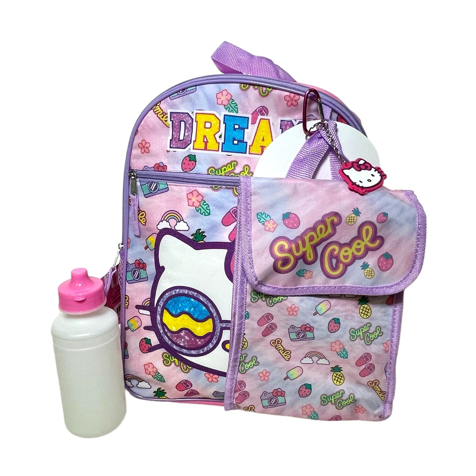 Mochilla Hello Kitty incluye: Bote para agua, lonchera, lapicera, llavero y mochila. Medidas mochilaAlto: 40 cmAncho: 12 cmLargo: 30 cmMedidas loncheraAlto: 26 cmAncho: 8 cmLargo: 17 cm